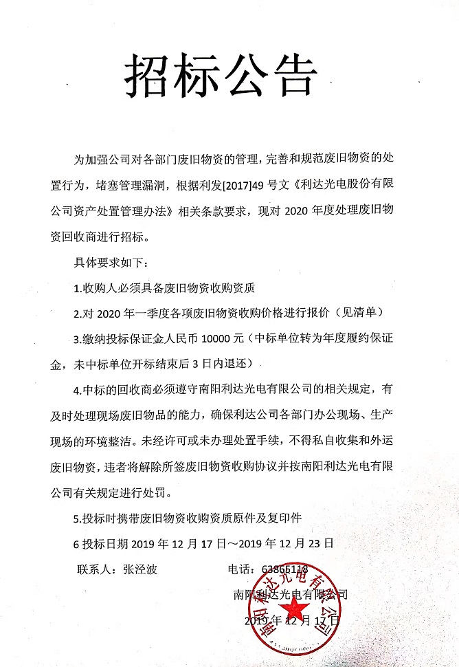 2020年度廢舊物資處理招標(biāo)公告